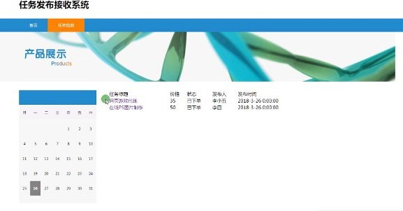 任務(wù)信息:以列表的形式展示了網(wǎng)站發(fā)布的任務(wù)信息,會顯示任務(wù)名稱,發(fā)布 日期,價格以及下單的狀態(tài)等,用戶在登錄后,能夠選擇在線接該任務(wù)或者選擇收藏任務(wù),等后期進行在線接任務(wù)。